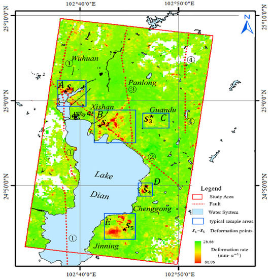 Kunming was located in late Cenozoic downfaulted basin with a complicated structure. It covers four major fault zone surrounding distribution, i.e., the Kunming Baiyi-Hengchong faults in eastern and central Heilongtan-Guandu faults, as well as west Pudu river and north west of Chenggong-Fuming fault (Figure 3). The fault is the surrounding potential earthquake source area in Kunming, as well as one of the factors of land subsidence that cannot be ignored. According to existing research, compared with linear urban land subsidence, subway and expressway, the crustal deformation in fault zone has its particularity, thereby suggesting that the small deformation magnitude and the remarkably slow change. The active intensity of most faults is several million meter per year, and the maximal exceeds a dozen million meter [43]. The Chenggong-Fumin fault with serious land subsidence was selected as the research object, and the cross-sectional lines perpendicular to the Chenggong-Fumin fault zone were made (Figure 3b), and the cross-sectional map perpendicular to the fault zone was created (Figure 7). The intersection of the blue vertical line and the section line in the figure represent the position of the fault line and the subsidence rate on the cross-sectional map. As depicted in Figure 7, the current vertical crustal deformation rate was relatively high in the near Chenggong-Fumin fault area and the maximal annual subsidence rate was −70 mm/a, thereby demonstrating significant tectonic movement in the study area is, especially controlled by the Chenggong-Fumin fault. According to existing studies on land subsidence, seismicity and tectonic movement in Kunming city [26,45], Since the late Cenozoic, the stress field in the Kunming urban area was dominated by the northward compressive stress, and the tensile stress was generated in the basin area bounded by the Puduhe fault. On that basis, the five blocks of Xishan, Puji, Sheshan, Longtan and Baiyi, are controlled and pulled northward successively by the Heilongtan–Guandu fault and Baiyi Hengchong fault. As impacted by the different degree in the consolidation fault zone, the distance of fault block pulling out was not identical. The longest block was Heilongtan, and the nearest block was Sheshan, thereby forming a tectonic type area of uplift and subsidence in the basin. The fault subsidence extent was inconsistent, and the extent of fault subsidence was large in the south and relatively small in the north. From the distribution of surface subsidence, the subsidence areas were all located in the southern urban area accordance with the Lake Dian, i.e., areas A, B, C, D and E marked in the blue rectangle in Figure 3.