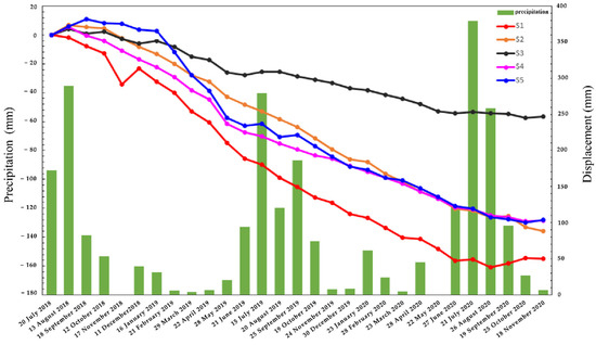 The precipitation data from July 2018 to November 2020 in the study area were acquired from China Meteorological Data Network (http://data.cma.cn/, accessed on 21 August 2021). The time-series values for feature points and monthly precipitation data in the study period are listed in Table 5. The time-series subsidence values of the five feature points in the study period were compared with the monthly average precipitation (Figure 10). According to the figure, the subsidence time-series of the five feature points showed a nonlinear decline with seasonal variations, and there was continuous ground subsidence at point during the whole study period. In November 2018, the precipitation in Kunming city was 0, and the subsidence value of that month achieved an extreme value of −34.4 mm. Over time, the cumulative subsidence rate reached the maximal of −160.7 mm in August 2020, and then the subsidence slowed down. From July 2018 to January 2019, and rose first and then subsided, during which the overall subsiding amount was relatively small. Subsequently, they continued to subside. In the rainy season of 2019, the subsiding rate slowed down and then continued to subside. From June to November 2020, the subsiding tended to be gentle. As depicted Figure 10, the period when the selected subsidence feature points decreased in the five vital subsidence areas corresponded to the rainy season with the maximal precipitation, thereby demonstrating that precipitation is inversely correlated with land subsidence. This is because rainfall is capable of penetrating into the ground through the soil and replenishing the groundwater level. With the rise of the groundwater level and the increase in the soil water content, the support of bedrock was improved, thereby effectively down-regulating the subsidence rate of the ground. In spring and winter, however, drought and little rain, soil water content decreased, groundwater extraction increased, groundwater level declined, bedrock lost support again, thereby intensifying land subsidence.