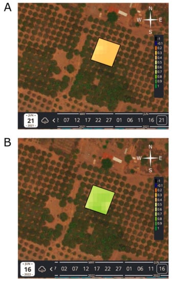 Additionally, the solar radiation interception fraction of the experimental plot was derived from the normalized differential vegetation index (NDVI) measurements from Sentinel-2 images (10 m resolution). The NDVI served as an indicator of the overall tree performance by quantifying the plant’s biomass, vigor, and density through satellite images. The NDVI values were obtained at the initial and final times of the experiment with Auravant® (www.auravant.com) (accessed on 21 June 2021).
