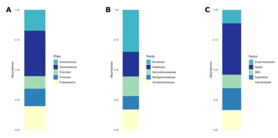 The bacterial community structure of the rhizospheric soil of the guava crop (P. guajava cv). (A) Relative abundance at phyla level. (B) Relative abundance at the family level. (C) Relative abundance at genera level.