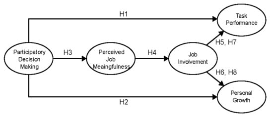 In this regard, this study focused on job meaningfulness and job involvement, perceived as a mediating process in which participatory decision making is linked to employees’ task performance and personal growth. Meaningfulness is a positive psychological state in which one’s job is perceived as valuable and useful [14,15]. Perceived meaningfulness makes members value their jobs and plays a role as an important antecedent factor that can improve performance by enabling members to perform their jobs more diligently and successfully [14]. In addition, perceived meaningfulness is closely related to personal growth because it increases self-esteem and acts as a motivating factor to increase one’s own competency [16]. Next, job involvement refers to the degree to which one has an attachment to and identifies with one’s own job, which motivates members and makes them perform their assigned tasks more steadily, thereby achieving a high performance. Additionally, job involvement is expected to play an important role as a mediator because it can serve as a motivating factor for self-growth to enable members to invest time and effort to perform their duties well and to develop their own capabilities.