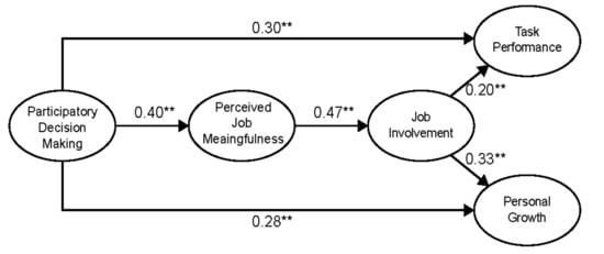 The path coefficient is presented in Figure 2; based on it, the research hypotheses were verified. Hypothesis 1 is about the relationship between participatory decision making and task performance, and Hypothesis 2 is about the relationship between participatory decision making and personal growth. According to the results of the study, participatory decision making had a significant positive relationship with members’ task performance (β = 0.30, p < 0.01) and personal growth (β = 0.28, p < 0.01). These results show that members can not only express their thoughts and opinions by participating in decision making, but can also listen to the thoughts and opinions of their bosses and colleagues at the same time, increasing the likelihood of task performance and personal growth. This is consistent with existing studies demonstrating that people can develop their own competencies as well as perform tasks effectively through participatory decision making [1,22]. This confirms that participatory decision making has a significant relationship not only with employees’ task performance, but also with their personal growth. Therefore, both Hypothesis 1 and Hypothesis 2 were accepted. Hypothesis 3 is about the relationship between participatory decision making and employees’ perceived job meaningfulness. Hypothesis 3 was also adopted because there is a significant relationship between participatory decision making and perceived job meaningfulness (β = 0.40, p < 0.01). The results of the analysis are consistent with the existing research, demonstrating that participatory decision making increases satisfaction and motivates members by giving them the impression that they are participating in important and valuable work [12]. Hypothesis 4 deals with the relationship between employees’ perceived job meaningfulness and job involvement, and employees’ perceived job meaningfulness had a significant positive relationship with job involvement; so, Hypothesis 4 was adopted (β = 0.47, p < 0.01). These results empirically show that employees’ perceived job meaningfulness is related to their job involvement.