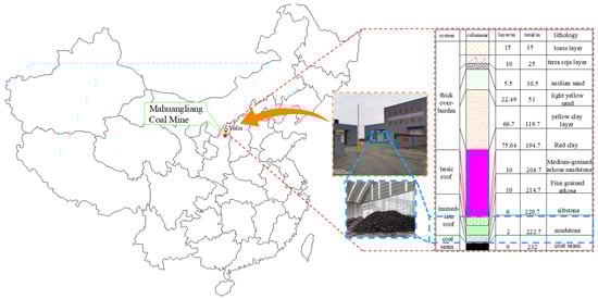 The gangue used in this research was taken from the Mahuangliang Mine in the southeast of the Yushen Mining Area (Yulin City, Shaanxi Province), a mine under construction. The minefield has a simple geological structure. The current main coal seam is a #3 coal seam, with a buried depth of 180–210 m and a coal seam thickness of 9.06 m. The gangue produced during mining mainly comes from coal bed gangue and roof gangue (Figure 1). It can be seen from the stratigraphic map that the gangue lithology is mainly mudstone, carbonaceous mudstone, silty mudstone, and argillaceous siltstone.