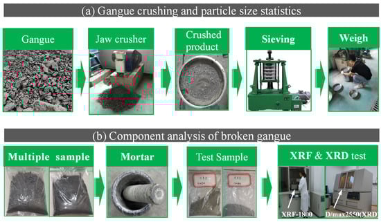 The test involved in this research is divided into two parts: gangue-crushing particle size statistics and chemical composition analysis. The specific test flow chart is shown in Figure 2.