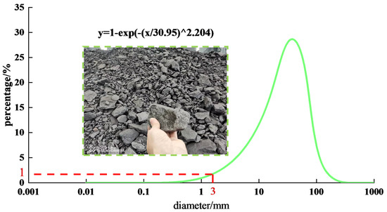 In Equation (1), represents the cumulative (%) characteristic particle size of the sieve residue and represents the uniformity index, which characterizes the breadth and narrowness of the particle size distribution range. The original particle size distribution curve (Figure 3) and gangue’s function expression are obtained using Matlab fitting and statistics. For this, the gangue collected at the mine site was used as an example.