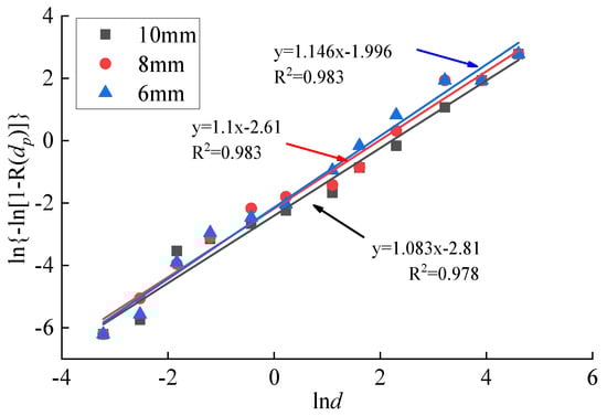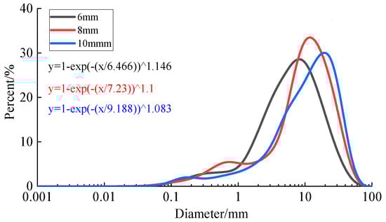 The particle size distribution of the gangue is depicted in Figure 5, where the width of the discharge port is 6–10 mm into the particular formula (2) of the particle size distribution. This was obtained from the linear regression line equation (Figure 5). It can be seen from Figure 5 that the gangue was broken under the influence of the discharge port widths. It was found that, overall, the particle size distribution trend of the gangue under the width of each discharge port is consistent and follows a normal distribution as the width of the discharge port increases. The characteristic particle size of gangue rises exponentially with the increase of the discharge port width, from 5.71 mm at a discharge port width of 6 mm to 13.35 mm at a discharge port width of 10 mm.