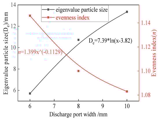 Figure 6 shows the variations in the characteristic particle size and uniformity index at different discharge port widths. It can be seen from Figure 6 that as the width of the discharge port increases, the particle size De of the characteristic value increases logarithmically, and the obtained expression is