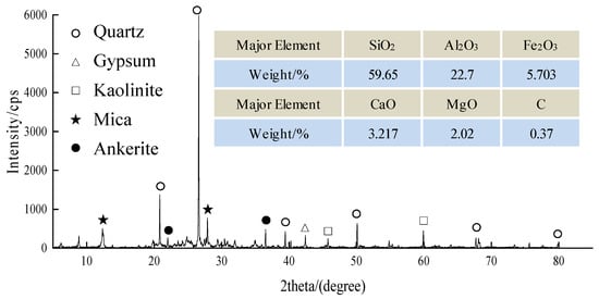 The scan results were analyzed by Jade to obtain the gangue phase composition. Figure 7 shows the phase composition of the gangue (XRD test results) and the proportion of main components (XRF test results). The results illustrate that the phase composition of the selected gangue mainly includes Quartz (SiO2), Gypsum (CaSO4), Kaolinite (Al2O3∙2SiO2∙2H2O), Mica ((KAl2(AlSi3O10)(OH)2)), Ankerite (CaMg(CO3)2), etc. The main chemical components, and their proportions, are SiO2 (59.65%), Al2O3 (22.7%), Fe2O3 (5.703%), CaO (3.217%), MgO (2.02%), C (0.37%), etc.