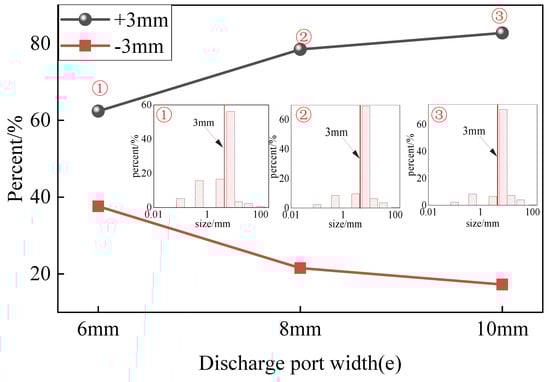Figure 8 elucidates the particle size distribution of crushed gangue and the yields of +3 mm and −3 mm particles at different discharge port widths. It can be seen from Figure 8 that the particle size distribution at each discharge port width conforms to the particle size distribution model in Section 3.1. As the width of the discharge port increases, the yield of the +3 mm particles gradually increases, and the yield of the −3 mm particles gradually decreases.