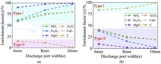 Figure 10 shows the enrichment of elements in the two-part particle size gangue. According to the variation in the enrichment ratio (θ) of each component with the width of the discharge port, the components in Figure 10a can be divided into four categories. The enrichment ratio (θ) of type I (including CaO and MgO) was always greater than 1.0 in the coarse-grained products. The enrichment ratio (θ) increased gradually as the discharge port width decreased. This shows that the proportion of coarse-grained products is always larger than that of the raw ore. According to Figure 7, this is because the components containing CaO and MgO, such as gypsum and dolomite, are difficult to break [], resulting in the enrichment of CaO, MgO, and other components in large particles. The enrichment ratio (θ) of type II (including Fe2O3) fluctuated around 1.0 and gradually increased with the increase of the width of the discharge port, indicating that with the increasing discharge port, Fe2O3 gradually enriches from fine to coarse particles. The enrichment ratio (θ) of type III (including Al2O3 and SiO2) increased slowly with the increase of the width of the discharge port, and the range was concentrated between 0.95 and 1.0; the change in enrichment ratio (θ) was not particularly significant. The reason may be that some of the SiO2 were stored in clay minerals with little hardness [], and some were deposited in silicate minerals with significant hardness, such as calcium silicate. As a result, the enrichment ratio of type III in the coarse and fine particle size is less affected by the discharge port, and the two particle-size products are seriously mixed. The enrichment ratio (θ) of type IV (including C) was always less than 1.0 and decreased with the increase of the width of the discharge port, indicating that C is mainly enriched in the fine-grained products after crushing compared with the original ore. According to the analysis in Figure 7, it can be seen that the phase composition containing Al2O3, SiO2, and C mainly consisted of kaolinite, mica, carbon, and other substances. These substances are relatively easier to break due to their low strength [,,]; thus, they were broken and enriched in the fine-grained products. Similarly, Figure 10b shows the enrichment of elements in the fine-grained gangue, and the changing trend of the enrichment ratio (θ) of each component in the fine-grained gangue is opposite to that in the coarse-grained gangue. In conclusion, in the jaw crushing process, the gangue particles containing CaO and MgO are enriched in the coarse-grained products as the width of the discharge port increases. The particles containing Fe2O3 in the gangue gradually concentrated from fine-grained to coarse-grained, and the gangue particles containing Al2O3, SiO2, and C were more easily broken and enriched in the fine-grained products.