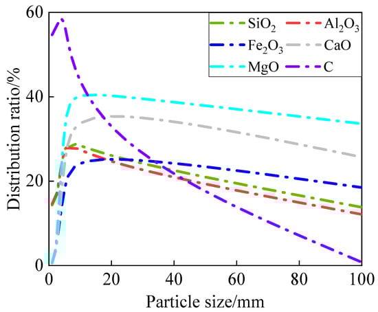 Figure 12 shows the enrichment of each component in gangue at different particle sizes. It can be seen from Figure 12 that the trend of each component changes with particle size in the form of “”. Among them, the enrichment ratios of SiO2, Al2O3, and C decreased with the increase of particle size (b > 0), and MgO, CaO, and Fe2O3 decreased with the increase of particle size (b < 0). The specific expressions are shown in Figure 12.