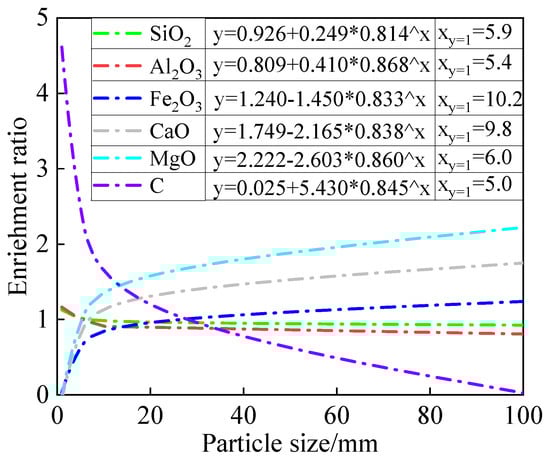 From the definition of the enrichment ratio, it can be deduced that if θ = y = 1.0, the element enrichment is the same as that of the original gangue. Therefore, according to the expression of the enrichment ratio of each component in gangue at different particle sizes presented in Figure 12, it is clear that the enrichment ratio of SiO2 is less than that of the original gangue when the particle size is greater than 5.9 mm. The enrichment ratio of Al2O3 is smaller than that of the original gangue when the particle size is greater than 5.40 mm. When the particle size exceeds 10.20 mm, the enrichment ratio of C is smaller than that of the original gangue. Similarly, when the particle size is smaller than 9.84, 6.0, and 5.0 mm, the enrichment ratio of Fe2O3, CaO, and MgO is correspondingly smaller than in the original gangue. According to the changes of each curve, the enrichment ratios of C, CaO, and MgO change significantly more than those of Fe2O3, Al2O3, and SiO2, which is consistent with the change of the distribution ratio of each component analyzed in Section 3.2.1.