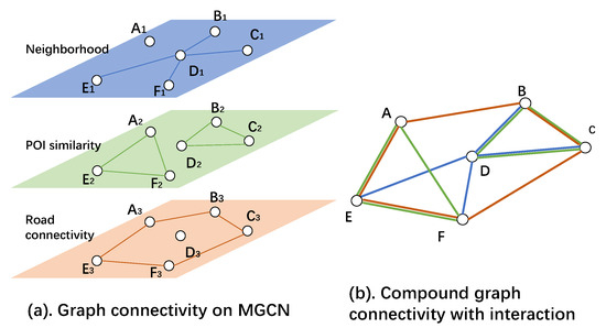 The spatial feature extraction by MGCN architecture is incomplete due to the lack of cross-graph connectivities. Figure 1 shows an example for MGCN. Consider the vertex (region) pair A and D. According to graph topology, A and D are disconnected in all three graphs. MGCN is incapable of extracting features from D for A or vice versa. However, we argue that the A-D relationship is important. The region pair - and - are closely related on road connectivity and POI similarity. A and D are related region pairs for spatial feature extraction. To complete the physical meaning for spatial feature extraction by MGCN, the ideal graph connectivity is shown in Figure 1b. It is produced by merging all edges from separate graphs, so that any random walk path is a compound of any kind of relationships.