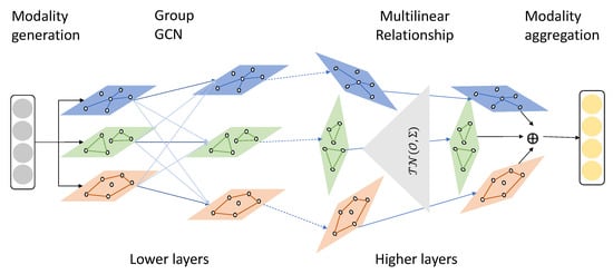 Overview of the proposed graph interaction mechanism for stacked MGCNs. The multi-modality representation of input signals is generated by multi-graphs. In lower layers of deep neural networks, we use grouped GCN to enable inter-graph spatial feature extraction. In higher layers, we use multi-linear relationship GCN to learn a modality-wise relationship by imposing a tensor normal distribution on the joint representation of parameters. Finally, we aggregate modalities to produce an output.