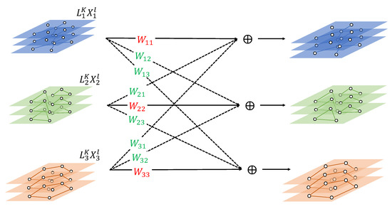 denotes the weight matrix to transform the ith modality input to the jth modality output via ChebNet transformation , where and are the feature dimension of the lth and th layer. K represents the degree of the Chebyshev polynomial, which is sliced during the computation of ChebNet.