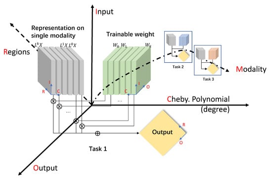The dimensionality transformation of graph convolution operations in ChebNet is shown in Figure 4. There are five dimensions in the whole system in total, including regions/vertices (R, ), inputs (I), outputs (O), Chebyshev Polynomial (C, ) and modalities (M). For each single modality task, the representation of input signals on graph laplacian is in a three-dimensional space of region, input and Chebyshev polynomial: . The model parameter for the ith modality is in a three-dimensional space of input, output and Chebyshev polynomial: . The joint representation for multi-modality weight is defined as a four order tensor