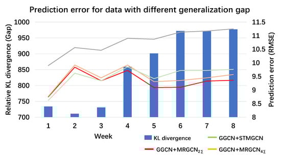 Figure 5 shows the generalization ability for different models, which validates the above arguments in detail. The data relative divergence (blue bar) was computed as the Kullback Leibler divergence [35] between the temporal pattern of the last week in the training set and temporal patterns of each week in the test set. We discovered that the gap between the training set and test set was accumulative. This indicates that the test data will become more and more divergent from the training data with time shifting. Models are expected to be more general to overcome this phenomenon. According to prediction error by weeks, the prediction error for STMGCN (the gray line) keeps increasing as the test data becomes more divergent. We believe this phenomenon is not caused by model capability, but model generality. For methods including GGCN and MRGCN, the model performance was less influenced by this generalization gap. There was no difference between the model capacity of STMGCN (MGCN) and MRGCN. The network architecture and connectivity were almost the same. This shows that MRGCN has a better generalization ability to avoid overfitting to the training set.