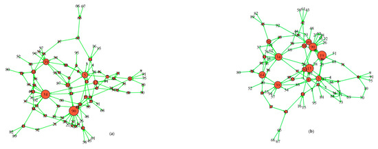 Network developed in RStudio with node size calculated from node degree centrality (a), and betweenness centrality (b).