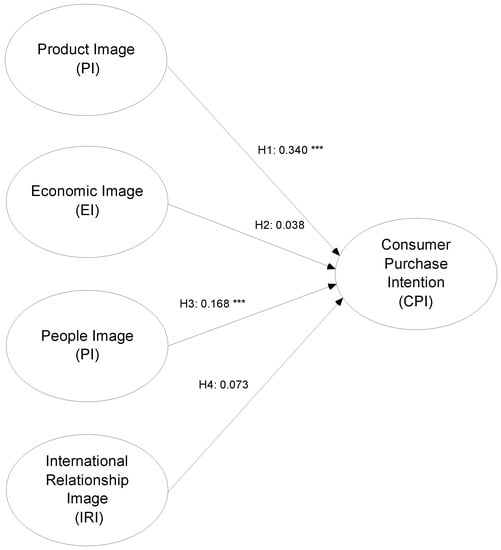 Nonetheless, H2 and H4 were rejected (b = 0.038, p > 0.05; b = 0.073, p > 0.05), contradicting the positive link predicted between economic image/international relationship image and consumer purchase intentions.