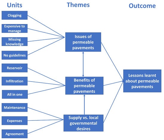 Based on the first readthrough of the interview transcriptions, ten meaning units were generated, which were then collected in the three themes: (1) issues of permeable pavements, (2) benefits of using permeable pavements, and (3) supplier versus local government desires, as shown in Figure 2.