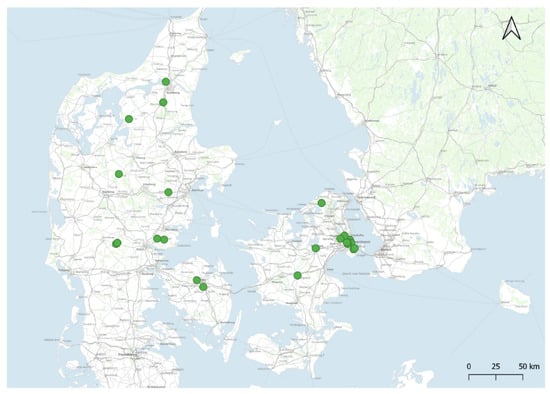 Permeable pavements are, as mentioned earlier, used as an SuDS solution in several European countries. In Denmark, these solutions are rather novel, with the first permeable pavement constructed in 2012 on a trafficked road near Billund Airport in Denmark. Since then, approx. 40 places with porous asphalt as the top layer and a permeable sub-base have been constructed all around Denmark; some of these are shown in Figure 3. The mapped overview shown in Figure 3 is gathered from the interviewed contractors in Denmark.