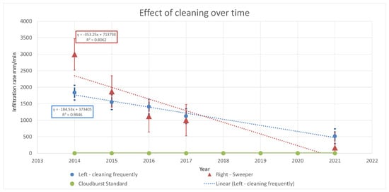 Respondents 1 and 3 were the clients of a permeable pavement project, as mentioned in Section 4.1. All parties have performed infiltration tests, where they placed a 100 mm tall plexiglass cylinder on top of the permeable pavement and measured the surface infiltration rate in mm/s. The measurements were taken once a year at the same exact location, starting in 2014 through to 2021. The results are shown in Figure 4 and are gathered from respondent 3. The permeable pavement is divided into lanes, so the left lane is cleaned once a year with a vacuum cleaner, whilst the right lane is cleaned with a sweeper. These methods are also used for traditional pavements. These are illustrated with blue and red regressions in Figure 4, together with error bars that indicate the variation between each measurement. The constant green line indicates 10 mm within 15 min of rain, which can be categorized as a cloudburst.