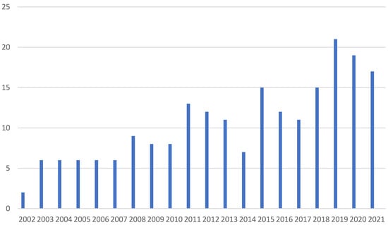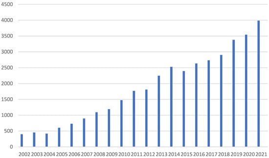 Scopus database articles for the query “Human Resource Management” for the last 20 years. The diagram presents nominal values. Source: own study based on data from Scopus database (accessed on 27 July 2022).