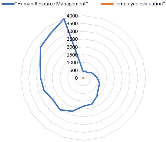 Nominal values for the queries “Human Resource Management” and “employee evaluation” for the last 20 years. Source: own study based on data from Scopus database (accessed on 27 July 2022).