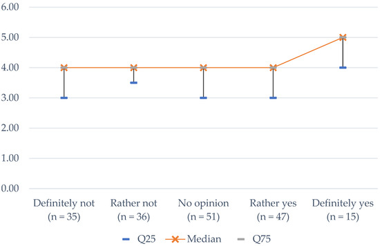 The degree of satisfaction of the surveyed employees with their responsibilities significantly depended on their opinions regarding the need for a system of periodic employee evaluations in the company. The Spearman’s rank order correlation analysis showed that the relationship between the above variables was positive and statistically significant: R = 0.18; t(N − 2) = 2.42; p < 0.05. This meant that a greater level of satisfaction with the scope of an employee’s responsibilities was accompanied by opinions more strongly favoring the necessity of periodic employee evaluations at the company. In the group of respondents who believed that the abovementioned system of periodic employee evaluations was definitely necessary, the level of satisfaction (on a scale of 1–5) with the scope of their responsibilities was higher (M = 4.6; SD = 0.63) than in the other groups distinguished by opinions on the need for the abovementioned system at the company (ranging from MNo opinion = 3.57/SDNo opinion = 0.73 to MRather yes = 3.77/SDRather yes = 0.84) (Table 9, Figure 4).