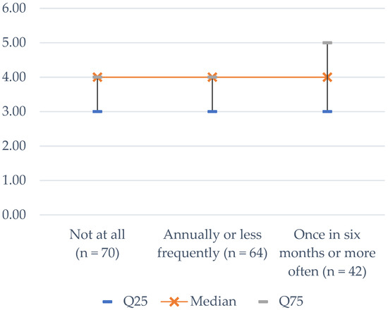On the other hand, the opinions of the surveyed employees on the appropriate frequency of periodic employee evaluations at the company depended significantly on their degree of satisfaction with the scope of their duties. Admittedly, the higher the appropriate frequency of evaluations suggested by the respondents, the higher their degree of satisfaction with their responsibilities (ranging from MNot at all = 3.69/SDNot at all = 0.84 to MOnce in six months or more often = 3.9/SDOnce in six months or more often = 0.98). However, at the accepted level of significance p < 0.05, no statistically significant relationship between the above variables was found, based on the results of the Spearman’s rank order correlation analysis: R = 0.11; t(N − 2) = 1.42; p = 0.157 (Table 10, Figure 5).
