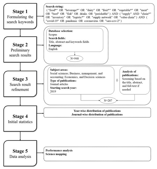 TITLE-ABS-KEY (“food*” OR “beverage*” OR “dairy” OR “fruit*” OR “vegetable*” OR “meat” OR “beef” OR “fish” OR drinks OR “perishable”) AND (“supply” AND “chain*” OR “inventory” OR “logistic*” OR “supply network” OR “value chain”) AND (“covid-19” OR pandemic OR coronavirus OR “sars-cov-2”).