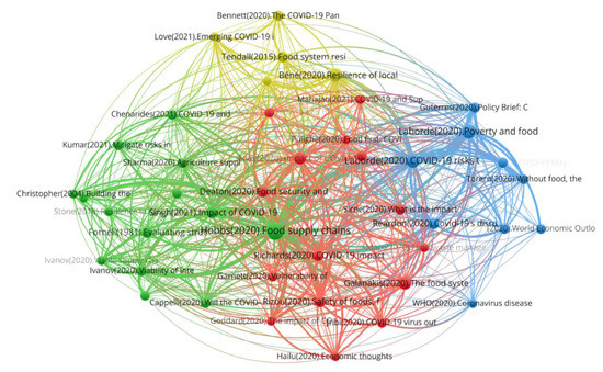 Reference co-citation analysis can identify areas of potential future research based on the cited publications [101]. The network considers references co-cited at least once (Figure 3). As a result, 43 references and 1,246 links were used to generate four clusters. Based on the number of nodes, the red cluster is the most important, comprising 15 studies that mainly focus on the impact of the COVID-19 pandemic on FSC systems and agriculture [2,99,102]. The second cluster (in green) contains 14 studies that examine the mitigation strategies and measures necessary to increase FSC resilience [103,104,105]. The third cluster (in blue) consists of nine studies discussing the risks of the COVID-19 pandemic to global food security [106,107,108,109]. Finally, the fourth cluster (in yellow) includes five studies that scrutinize the impact of the pandemic on seafood systems [110,111,112].