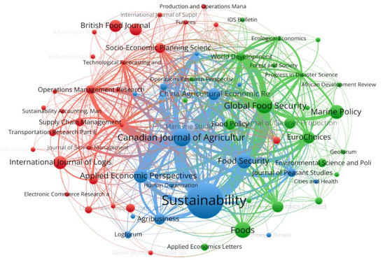 According to Tsay et al. [113], journal publications are the most important way for academics to disseminate their findings. Journal co-citation analysis is a powerful approach for revealing the overarching structure of a research field and pinpointing the primary publishing avenues responsible for the field’s intellectual growth and progress [114]. For this study, the journal co-citation network is depicted in Figure 4. The node’s size in the map corresponds to the number of publications of the journals included in the sample. Overall, the network contains 68 nodes and 1,146 edges in the field of FSC research. Three clusters of journals construct the network. The first cluster includes journals focusing on supply chain management, logistics, and operations research (e.g., the International Journal of Logistics Management, Operations Management Research, the International Journal of Logistics Research and Applications, Supply Chain Management). The green cluster includes journals related to food sciences and agriculture (e.g., Global Food Security, Foods, Food Policy, Agricultural Economics). Finally, the blue cluster contains journals with sustainability and country-specific foci (e.g., Sustainability, the Canadian Journal of Agricultural Economics, the China Agricultural Economic Review, the American Journal of Agricultural Economics).