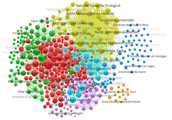 Initially, FSC research in the COVID-19 context was concentrated on research institutes and centers (e.g., WorldFish, the International Food Policy Research Institute). With time, and in tandem with the unfolding of the pandemic, universities took an active interest, assembling teams of scholars and researchers who accelerated the progress of FSC research in the COVID-19 era. We generated an institution co-citation network to identify the top influential institutions contributing to this research strand (Figure 5). Results specify that the University of Saskatchewan is the most influential institution, followed by WorldFish and the National Institute of Industrial Engineering. Interestingly, no institutions from Malaysia or Italy made it into the top ten most influential institutions in the field, although these countries are among the top nations based on research productivity. We may infer from this analysis that research is both extensive and comprehensive, with a wide variety of institutions and nations concentrating on the same issues. This finding, however, also calls attention to the need for stronger collaboration and coordination across institutions to enhance research quality and output.