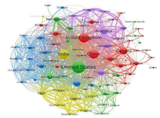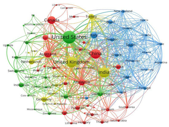 Figure 6 depicts the countries’ co-authorship network. Table 8 presents the countries with at least six publications that are included in the network. Total link strength was determined for each of the 86 countries based on the number of co-authored publications with each other country. We chose the ten countries with the highest total link strength and found some interesting patterns. The countries in the graph are organized into four clusters, and there are a total of 1096 links and 1498 total link strengths. The United States, the United Kingdom, and Malaysia are found on the top, with 51, 45, and 46 countries of co-authorship networks, respectively.