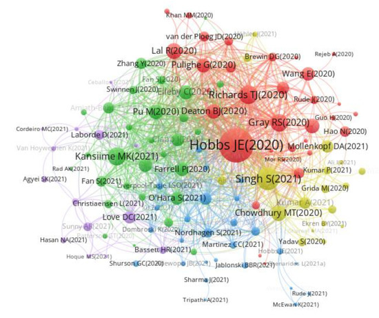 Additionally, Richards and Rickards [94], the third most-cited paper, analyzes the impact of COVID-19 on Canadian fruit and vegetable markets. Table 7 lists the top ten cited authors in the area of COVID-19 and the FSC. According to the results, Hobbs is the most frequently cited scholar, followed by Singh and Kumar.