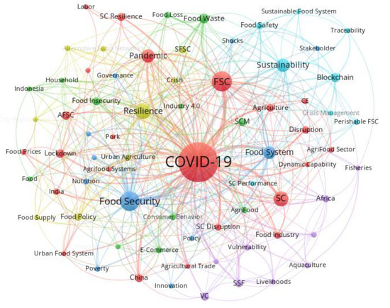 Using BibExcel we analyzed the most popular search terms (Table 5). Looking at the keywords in the 287 selected publications, the top 20 most common keywords were identified. Our findings show that the most frequently used keywords are linked to those that were entered into the search engine (cf. Figure 1). These keywords include COVID-19, food supply chain (FSC), food security, resilience, supply chain (SC), and pandemic. Besides these, other relevant keywords reflecting topical issues included sustainability, food system, food waste, blockchain, and disruption.