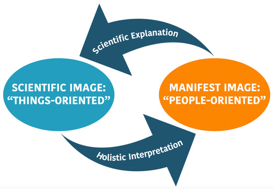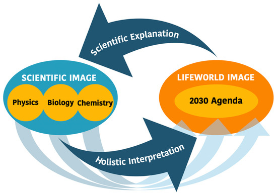 In Figure 3, the 2030 Agenda is conceived as belonging to the lifeworld image. Any of the 17 SDGs would then ask for a scientific explanation, and every scientific explanation would have to be interpreted again in the context of these goals. The resulting cycle and its iterations do not represent a hermeneutic circle. As noted by Sellars [74] and more recently by Roher et al. [73], finding one’s way around the world requires the lifeworld image and the scientific image to be on a level playing field.