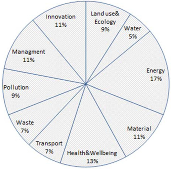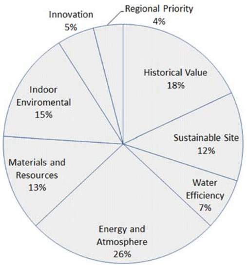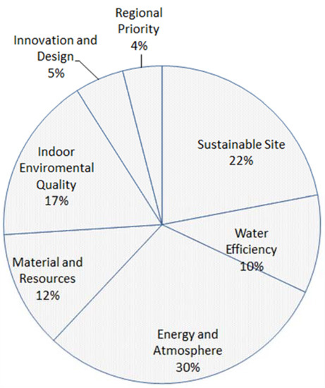 LEED is the most broadly used rating system worldwide, which was developed by US Green Building Council in 1998. According to LEED credits, existing buildings and buildings under construction can be certified using the LEED rating system, which includes four levels: platinum, gold, silver, and certified. LEED has seven basic criteria: sustainable site, water efficiency, energy and atmosphere, material and resources, indoor environmental quality, innovation and design, and regional priority (see Figure 2). Meanwhile, the energy criterion has the highest score [43,44].