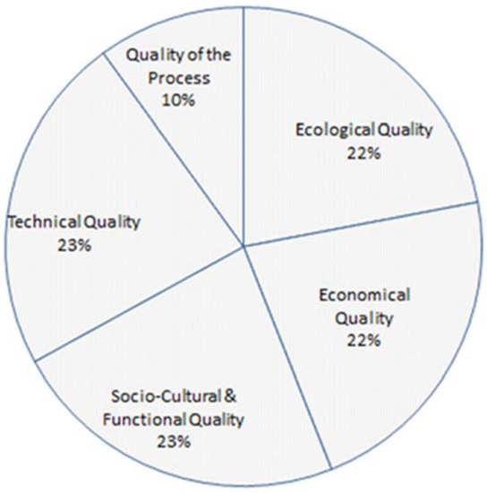 For the first time, DGNB was launched in 2009. Unlike other systems, in this rating system, equal attention is paid to the three dimensions of sustainability, i.e., social, economic, and environmental (see Figure 3). The DGNB system includes three other categories of less important weight factors: technical, process, and site quality. Total points lead to certification at four levels: DGNB bronze (35 points), DGNB silver (50 points), DGNB gold (65 points), and DGNB platinum (80 points) [45,46].