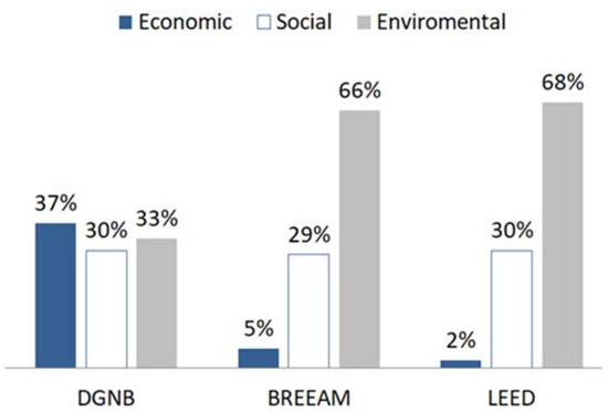 The comparison of indicators in each system showed that 55% (on average) of the focus is on the environmental dimension. The social dimension accounted for an average of 30% of the weighting across the three. Apart from these three systems, LEED and BREEAM assigned the lowest degree (5% and 2%, respectively) to the economic dimension. In the contrary, DGNB pays the most attention to the economy (60%). Overall, a more balance between the three dimensions of sustainability can be observed in the DGNB system (Figure 5) [49].