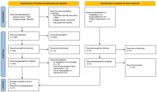 This section provides an overview of the systematic review framework conducted for literature and previous research on sustainable rating systems with a focus on their application to historic buildings. This systematic review follows PRISMA (Preferred Reporting Items for Systematic Re-views and Meta-Analyses) guidelines (as presented in Figure 6 and Figure 7) by Page et al. [50], based on Liberati et al. [51]. In this framework, we identified the available literature on sustainability and historic buildings by searching Science Direct and Google Scholar. We searched for articles published in English from 2010 until 2022. Since the issue of sustainability is very broad and has many sub-categories, in the first step, the general keywords were used, including “sustainability” and “conservation” or “rehabilitation” or “renovation” and “historic building” or “historical building” or “built heritage”. Then, a subset (sustainable rating system) related to sustainability was searched separately in combination with the keywords “cultural heritage” or “historical buildings”. Due to the enormous amount of search hits in Google Scholar, for only the first 40 pages (due to the exceeding number of “grey literature”—or articles not formally published by commercial academic publishers—occurring on average at page 20 to 30 as a majority of each page in Google Scholar [52]), 10 results per page were screened. The search yielded 1150 articles by “sustainability “and “conservation” or “rehabilitation” or “renovation” and “historic buildings” or “historical building” or” built heritage” keywords and 240 articles by “historical building” or “historical buildings” keywords.