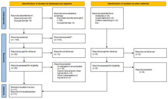 Example PRISMA diagram for keywords: “sustainability” and “conservation” or “rehabilitation” or “renovation” and “historic buildings” or “historical building” or “built heritage”. [PRISMA instruction: * Consider, if feasible to do so, reporting the number of records identified from each database or register searched (rather than the total number across all databases/registers); ** If automation tools were used, indicate how many records were excluded by a human and how many were excluded by automation tools.].