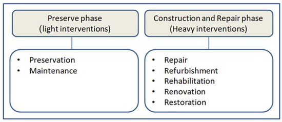 | Renovation | Actions to upgrade building components to today’s level, for example, improving energy efficiency in a historic building [68]. |