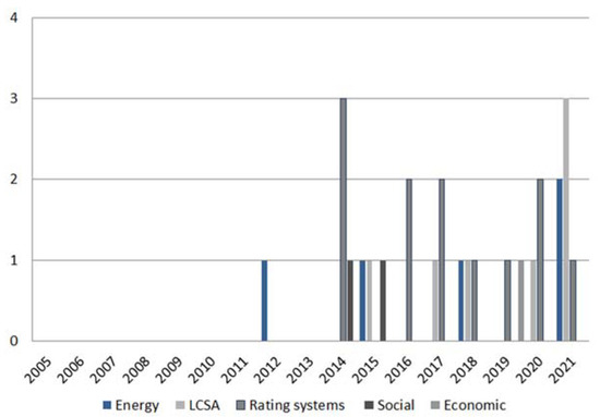 (b) Identify and compare different existing rating systems: In recent years, the attention of the construction industry to the issue of sustainability has increased. Accordingly, the review of related articles from 2010 to 2022 shows a significant increase in publications since 2014 (Figure 10). Most rating systems focus on the environmental dimension of sustainability. Among the rating systems, DGNB pays equal attention to all three pillars (environmental, economic, and social) of sustainability. Furthermore, most research has been done on LEED.