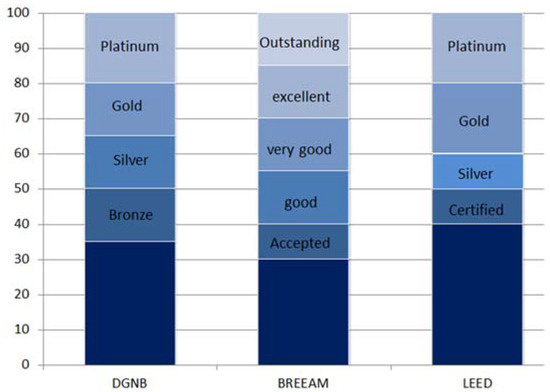 (c) Ways of evaluation and calculation in sustainable rating systems: Each rating system has different calculation methods to evaluate the level of sustainability in buildings (Figure 11). For instance, the highest level of LEED system (palladium) is not equivalent to the highest degree of BREEAM (excellent) in terms of sustainability characteristics or environmental effects [31]. The sum of points obtained from different indicators creates different levels in each rating system. In DGNB, total points lead to certification at four levels: DGNB bronze (35 points), DGNB silver (50 points), DGNB gold (65 points), and DGNB platinum (80 points). Depending on the number of points, the awarded buildings can be classified as accepted (30 points), good (45 points), very good (55 points), excellent (70 points), and outstanding (85 points). LEED includes four levels: certified (40–49 points), silver (50–59 points), gold (60–79 points), and platinum (80+ points).