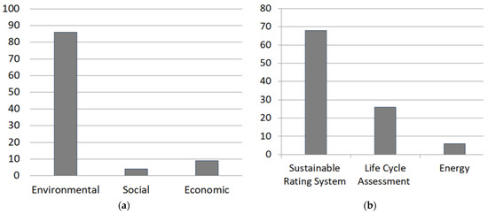 In the conducted research, among the sustainability goals in historic buildings, more emphasis has been placed on increasing energy efficiency and life cycle impacts of historical buildings [68,69,70,71]. On the other hand, less attention has been paid to the cultural and economic dimensions of cultural heritage. More than 80% of the reviewed articles are related to the environmental sustainability of historic buildings. However, a few of the articles were related to economic and social aspects (as presented in Figure 12a). This highlights that solving environmental problems is one of the priorities of the historical building industry. Among these, the most comprehensive research that includes all sustainable environmental indicators was related to rating systems (as presented in Figure 12b).