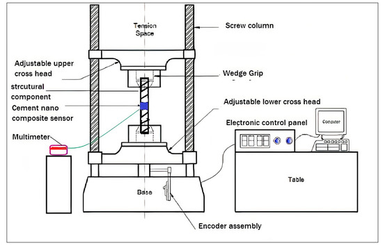 The multimeter N- 115/138/30 was used to measure the resistance of the cement nanocomposite specimens during the curing period. The probes of the multimeter were connected to the electrodes by crocodile clips, as shown in Figure 1c. To study the electrical properties of the composite, the Agilent digital multimeter 34,401 A was used to measure the variation in resistance by applying the mechanical load to the specimen. The probes of the multimeter were connected to the steel mesh by crocodile clips. The mechanical tests, such as the compression test on the cube sensors and the flexural test on the beam sensors, were carried out using a UTM of 10-ton capacity with a loading rate of 1 mm/min. as shown in Figure 1b,c. Figure 2 illustrates the electromechanical test setup for specimens.