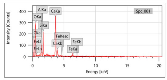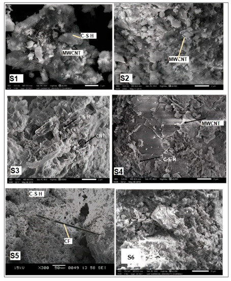 The scanning electron microscope (SEM) results with energy dispersive X-Ray spectroscopy EDS of Samples (1) to (5) are presented in Figure 3. The Figure 3 indicates, the dense formation of the matrix due to the addition of nanomaterials into the cement matrix. Since Portland cement is a porous material, the addition of nanomaterials into the matrix will fill all the pores of the cement matrix, hence the strength of the matrix increased and shrinkage cracks decreased. From images S1 to S5, it is observed that steering fillers are well dispersed and there is good bonding between the nanoparticles and the cement matrix. However, in some places, there is a formation of agglomerate and the presence of an identical slight quantity of MWCNT and CF, as shown in S1, S2, S3, and S4. This is due to the strong Van der Waals forces between the MWCNT particles, hence effecting the conductive networks. The sample S1 indicates the agglomerate of MWCNT around C-S-H gel in a few places compared to other samples, as it contains only cement paste and MWCNT. When carbon fibers are added into the cement matrix with the MWCNT provides better formation of the conductivity network. The Figure 3S6 sample shows the SEM image at 10 μm. From the EDS results, as per Figure 4 and Table 4, the higher percentage peaks were observed for the presence of Carbon (C), Silicon (S), and Oxides (O). The presence of a higher percentage of carbon content is responsible for inducing the conductivity properties in a composite.
