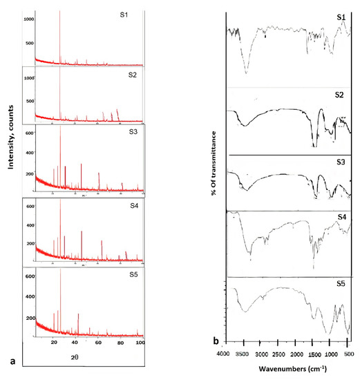 (a) X-ray powder diffraction (XRD) graphs of Samples (S1 to S5) (b) Fourier-transform infrared spectra of Samples (S1 to S5).